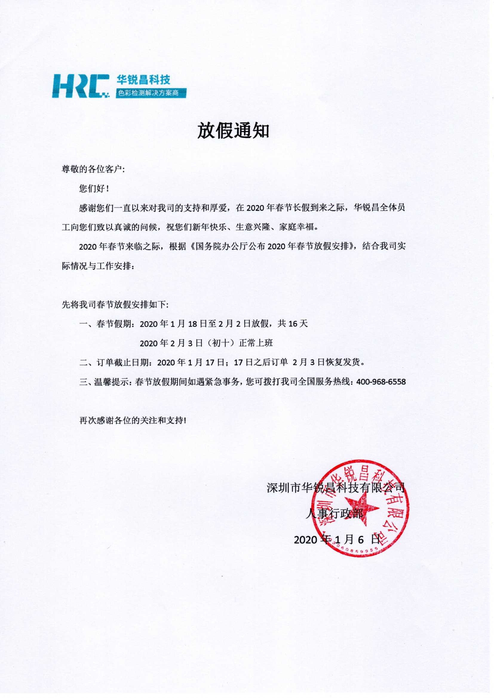 三、溫馨提示:春節放假期間如遇緊急事務,您可撥打我司全國服務熱線:400-968-6558