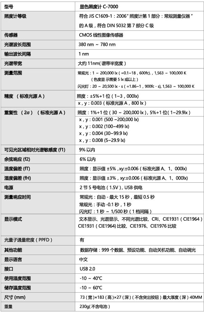 賽科尼可.世光SEKONIC顯色照度計C-7000是一款小巧、易用的光源(包括LED照明和EL照明)測量儀器,可提供CRI顯色指數、光譜輻射照度、峰值波長、三刺激值、色度、相關色溫、特征波長、色純度、照度以及差值測量的入門級解決方案,顯色照度計C—7000是一款輕便的手持式測量儀器,用于測量光源(包括全新的LED和EL光源)的色彩和照度。測量數據是以CRI顯色指數、三刺激值、照度、色度、特征波長、色純度、相關色溫和與目標的差值形式顯示的,C—7000可搭配另購的閃光同步線進行攝影閃光燈的光譜測量,作為標準配件隨附的實用軟件內含了用于數據捕捉和分析的更多高級功能。