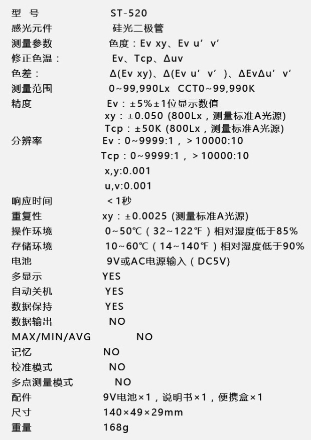 應用彩色LED燈、商業顯示、電影電視、倉庫、藝術館、博物館、學校、劇院、圖書館、體育館、競技場ST-520色溫照度計詳細資料特性精密儀器用于測量光照度符合CIE明視光譜響應數據保持快速響應。
