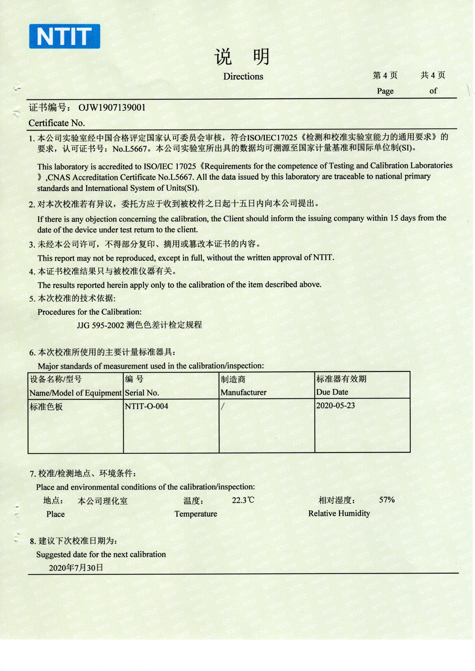 HRC華銳昌色差儀國家計量測試中心校準證書